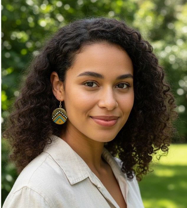 Celebrate the intersection of ancient tradition and contemporary design with our Prithvi Chakra Terracotta Danglers. These perfectly round earrings are individually handcrafted from the pure, native clay of Gorakhpur, Uttar Pradesh, the revered region that holds the official GI-Tag for its celebrated terracotta artistry.